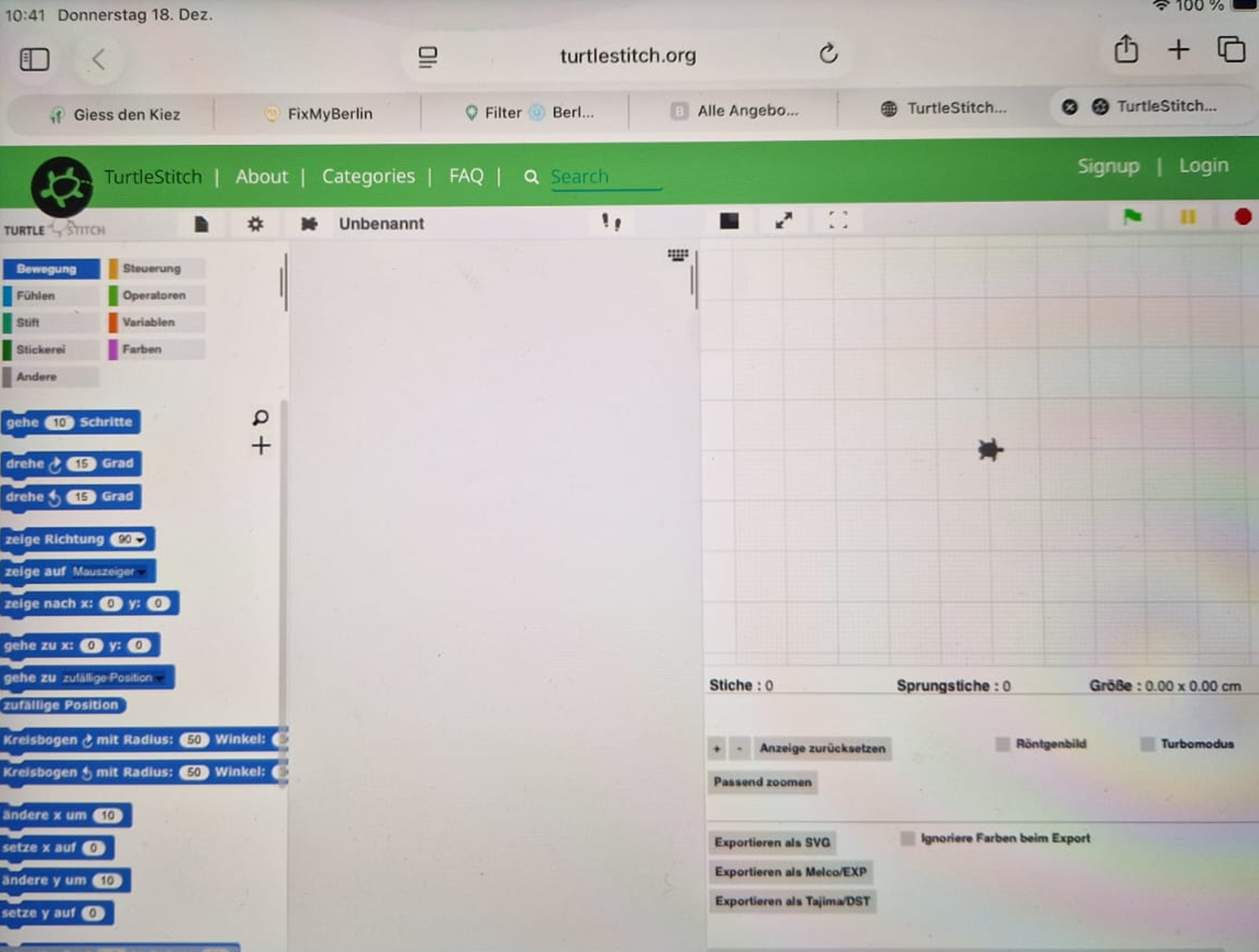 Schülerinnen und Schüler können auf einer Oberfläche, die der Kinderprogrammiersprache Scratch ähnelt, Stickmuster entwerfen.